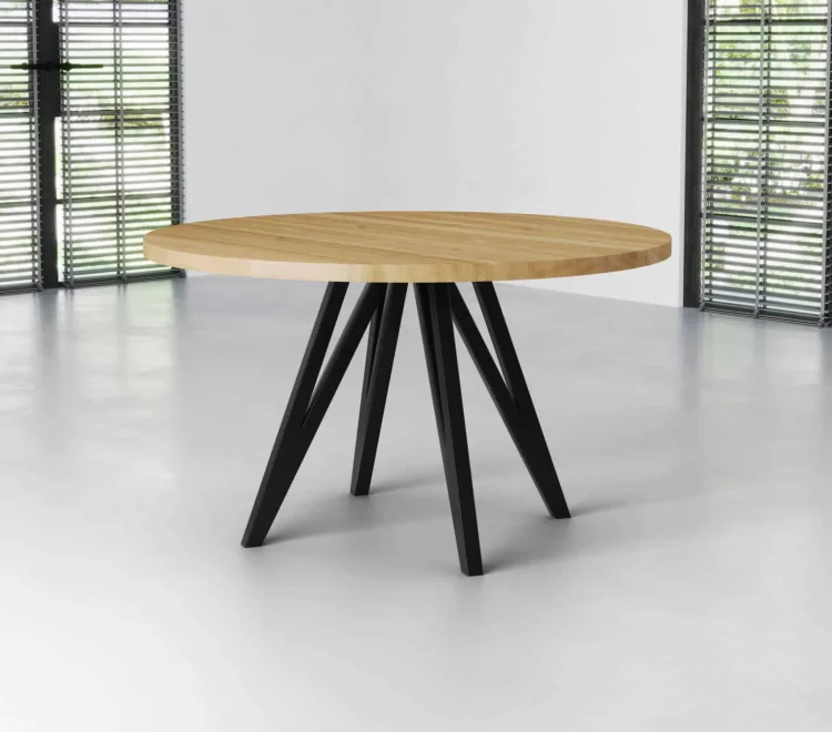 Der Steiger Esstisch Eiche rund 140 cm mit Star-Gestell in Schwarz vereint natürliche Eleganz mit einem modernen Design. Durch seine runde Form entsteht ein gemütlicher Mittelpunkt, an dem Familie und Freunde gerne zusammenkommen. Außerdem sorgt die massive Eichenplatte für Wärme und Charakter. Gleichzeitig verleiht das stabile Metallgestell dem Tisch einen klaren, zeitlosen Look.